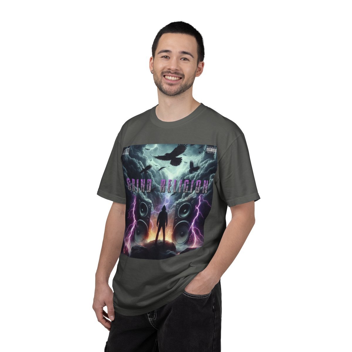 This heavyweight, garment-dyed tee brings cinematic energy to everyday wear. A bold, neon-lit graphic sits squarely on the chest: a lone figure framed by towering speakers, crackling purple lightning, and a thunderous sky — an anthem for late-night drives, basement mixes, and those who live for the drop. The soft, garment-dyed cotton feels lived-in from the first wear, while relaxed, roomy proportions keep movement easy. Wear it when you want to feel unstoppable — whether you're laying down tracks, heading to a small venue, or chasing inspiration under city lights.