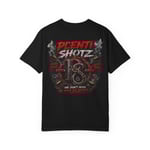 This heavyweight garment-dyed tee brings a bold, lived-in look to street-ready wardrobe staples. The shirt’s dark canvas lets the fiery emblem — a stylized “18” ringed by molten metal and sparks — stand out with cinematic contrast. It drapes with a relaxed fit and soft, broken-in hand from the after-construction dye, so it feels like an old favorite from the first wear. Wear it to shows, late-night meetups, or when you want your outfit to say confident and a little dangerous without shouting. The sewn-in label and durable double-needle stitching mean this tee holds shape and color through lots of wears and washes, while the heavyweight cotton keeps it substantial and grounded. Available in a wide range of colors and extended sizes, this shirt is for anyone who wants bold graphic attitude with a comfortable, lived-in feel.