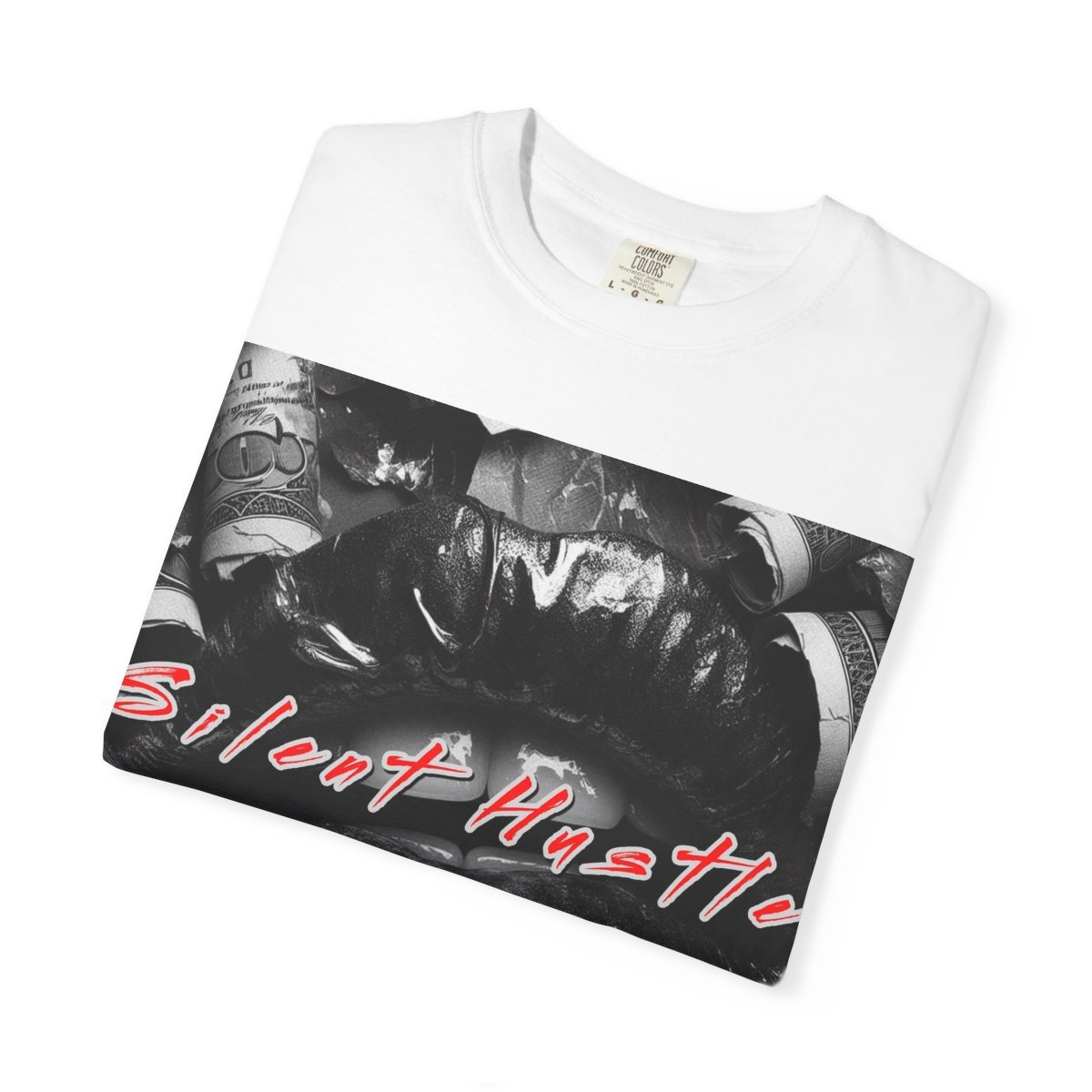 Soft, heavy-knit tee with a bold, streetwise print — this garment-dyed cotton shirt wears like a lived-in favorite. The front square graphic centers glossy, shadowed lips and stacked cash with a hand-lettered "Silent Hustle" across the image, giving a noir, late-night vibe. It drapes relaxed over the body, breaking in with each wash so the color and texture mellow over time. Wear it when you want a low-lit aesthetic for city nights, studio sessions, or when you’re layering up for a weekend of crate-digging and late shows. The sewn-in label and tubular construction keep the silhouette clean, while the heavyweight 100% ring-spun cotton holds the print and shape through repeated wear.