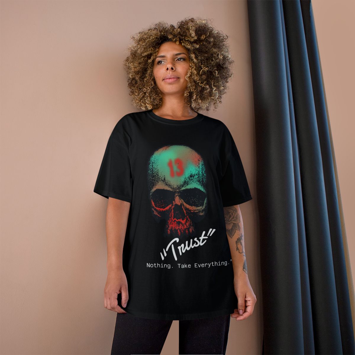 This classic tee carries a weathered, slightly rebellious spirit. A soft-but-structured Champion shirt anchors an artful skull graphic marked with a bold ‘13’—an image that reads like a worn concert poster or a page torn from an underground zine. The low-profile script “Trust” and the small line “Nothing Take Everything” below it add a cryptic, defiant edge. Wear it layered under a denim jacket for late-night shows, or alone when you want a clean silhouette with attitude. It feels familiar the moment you put it on and holds up through washes and weekends without losing shape.