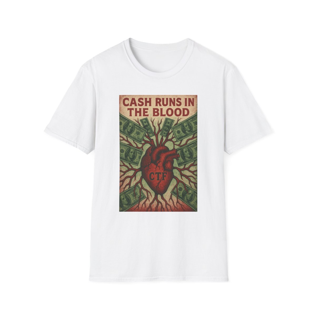 This lightweight crew-neck tee carries a bold, vintage-inspired graphic that declares “Cash Runs in the Blood” above an anatomical heart sprouting roots and dollar-bill leaves. Soft, ring-spun cotton drapes easily over the body, so the art sits flat and vibrant. Wear it layered under a denim jacket or alone while making a statement at markets, protests, or late-night shows. The tone is tongue-in-cheek and proud — a little rebellious, a little playful — built for people who want their wardrobe to speak with personality. The tear-away label and stable ribbed collar keep the shirt comfortable all day. Ethically sourced cotton and Oeko-Tex certification mean the tee feels right to wear as well as to show off.